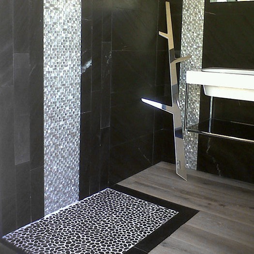 Ein innovatives Sortiment an Ganzkörper-Glaspasten-Mosaiken, vollständig recycelt in den Formen von Fluss Stein , die Sammlung Riviera von dem Boxer schlägt dieses mattschwarze Mosaik vor, die richtige Lösung für diejenigen, die einen einfügen möchten natürliche Details auf einfache Weise in seinen Raum, ohne an Eleganz zu verlieren.
