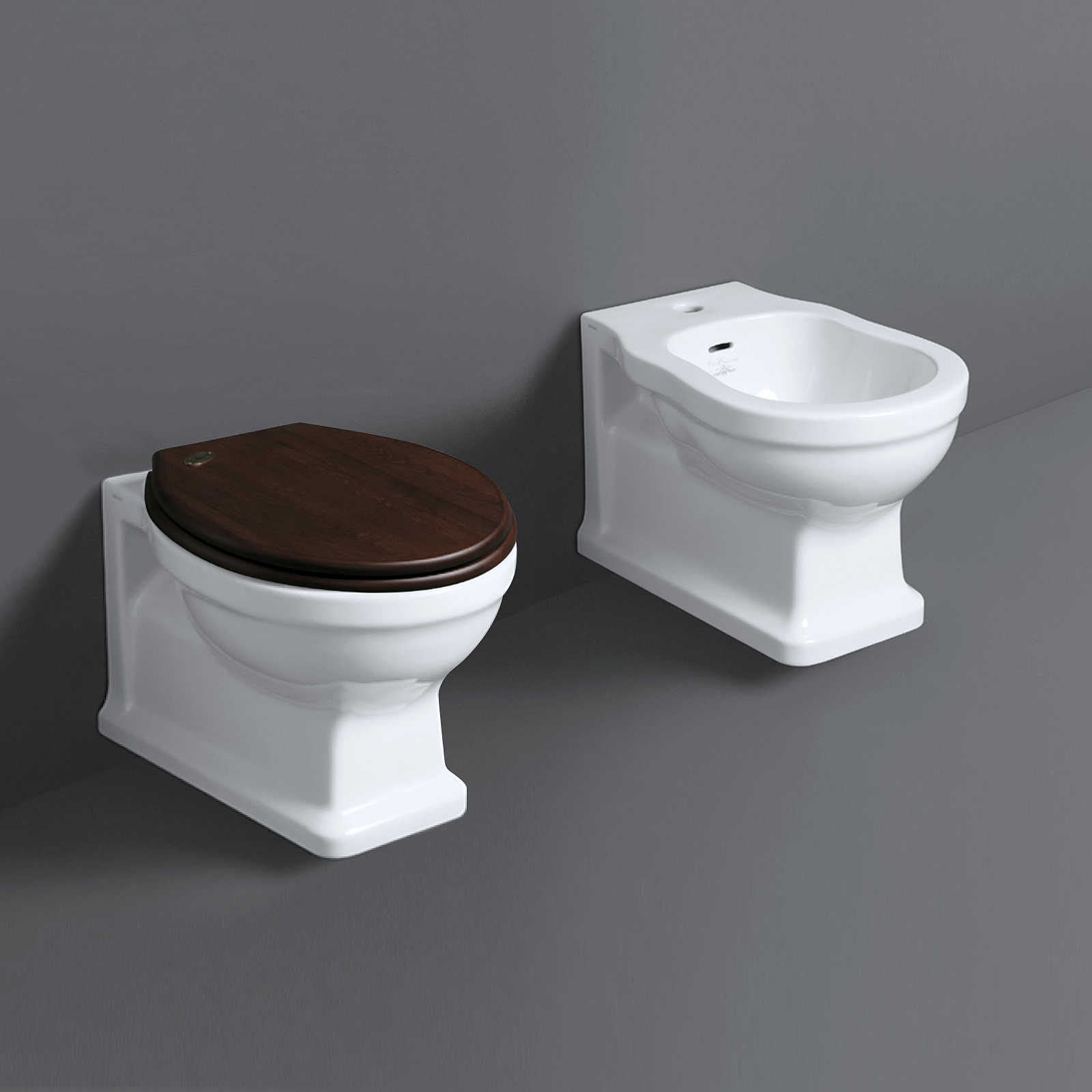 Glänzend weiße wandhängende Sanitärkeramik aus altem England: WC, Bidet und Toilettensitz aus Nussbaumholz - Londra, Simas