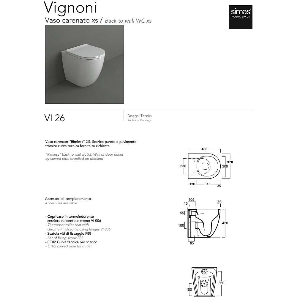 Der Simas Vignoni XS VI26 WC-Becken Es ist die ideale Lösung für alle, die das elegante Design der Vignoni-Kollektion auch in kleinen Badezimmern wünschen. Mit einer Tiefe von nur 48 cm Dieses kompakte Stand-WC schließt perfekt bündig mit der Wand ab (Rücken an der Wand), optimiert den Platz und sorgt für eine saubere, moderne Ästhetik.
