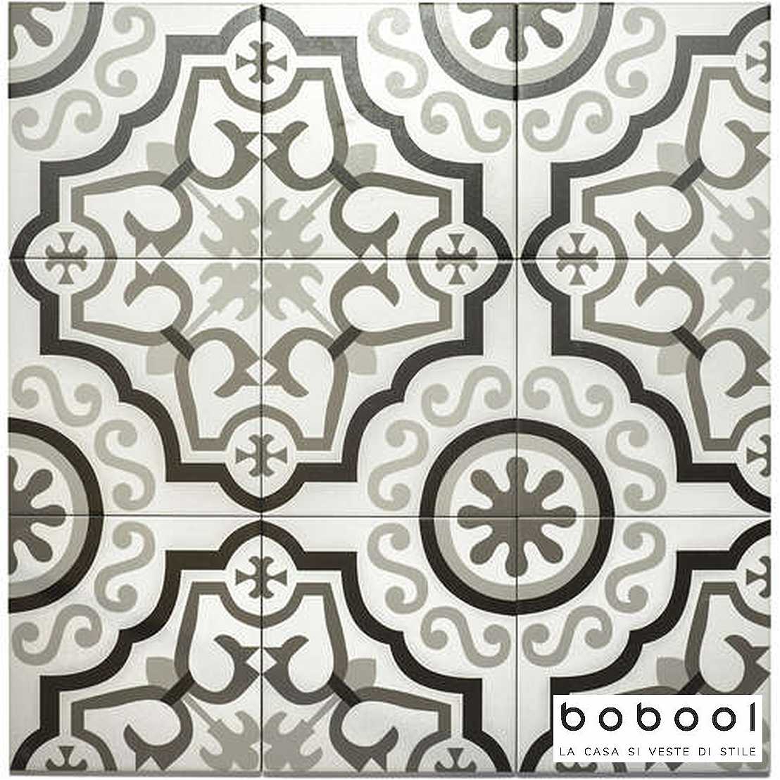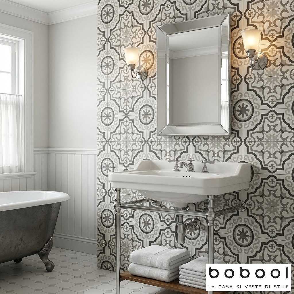 In this 20x20 porcelain stoneware masterpiece, the cold perfection of modern technology meets the warmth of tradition. The motifs, a sublime interweaving of geometric and floral patterns in shades of gray, they create a visual balance that captures the eye and furnishes the space with discretion and character.