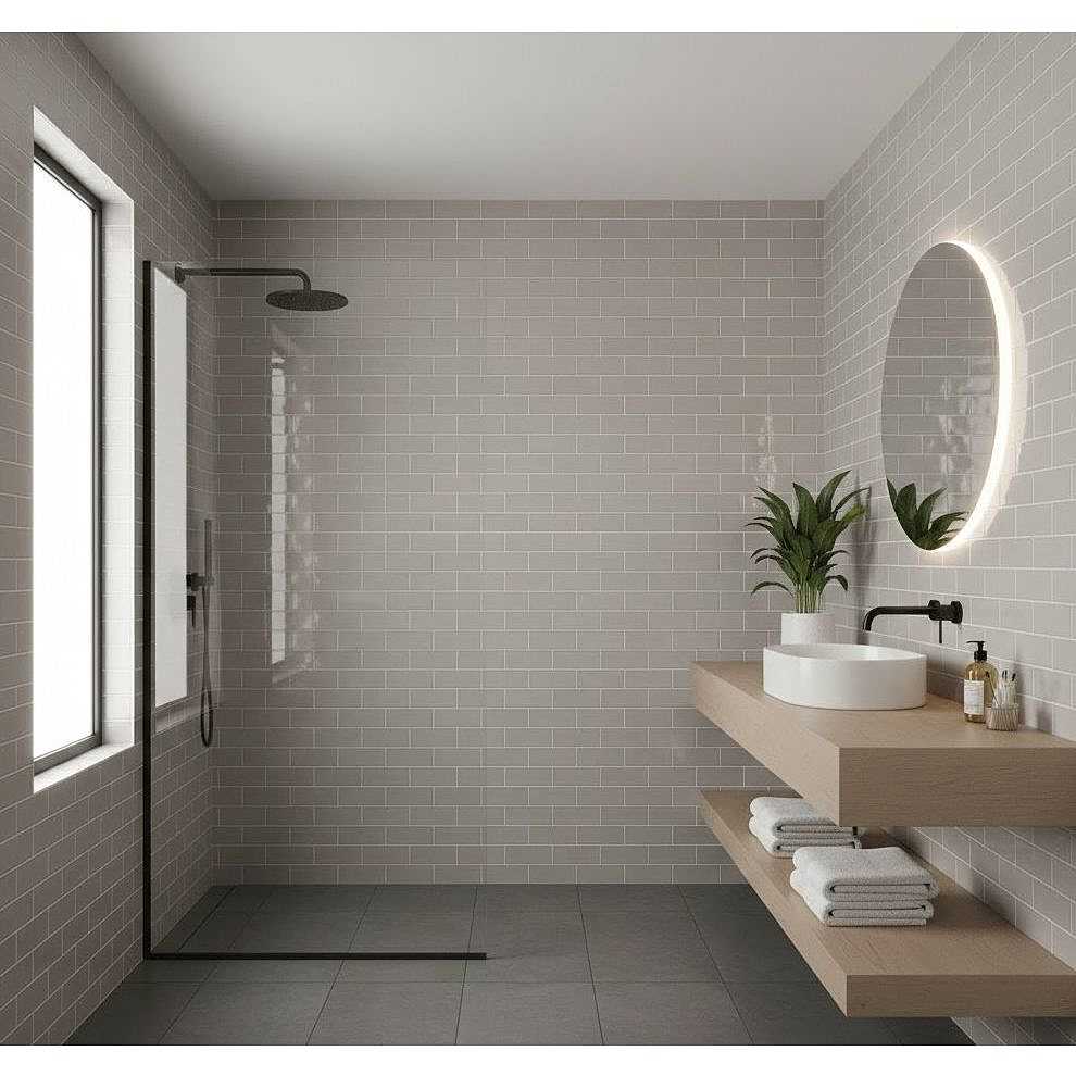Crystalline Reflections: The finish shiny Applied on a pearl grey background it creates a mirrored surface that visually amplifies the space. The slight undulation of the tile breaks up the reflections in a soft way, avoiding excessive glare.