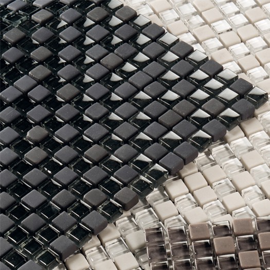 Glass mosaics composed of tesserae, as the name suggests, extremely small 10x10 mm and 6 mm thick. The two types of glass are classic glass + full-body and completely recycled glass paste. On network. Ok floor, ok wall covering.