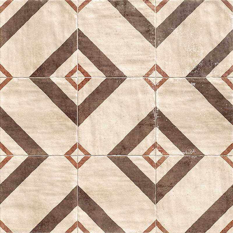 Viterbo Mainzu is a double-fired tile, in shades of beige, brown and terracotta, decorated with a cement tiles effect pleasantly vintage.