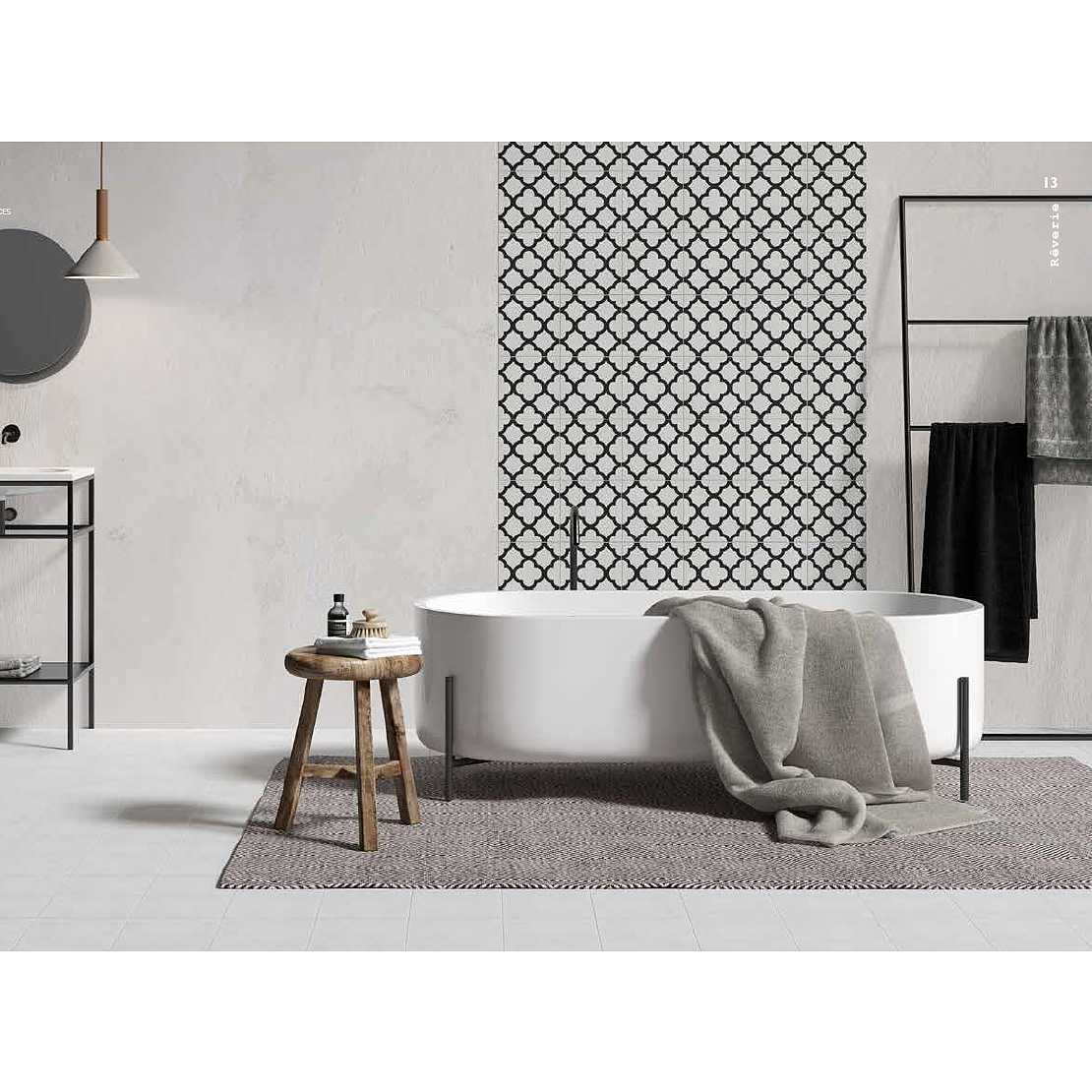 A tile elegant and timeless, characterized by a cement effect obtained with a delicate decoration in black and white : Reverie Black and White Of