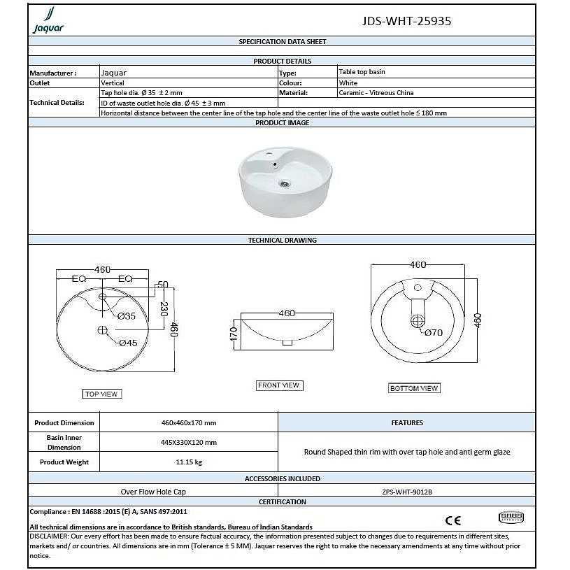 Le Jaquar JDS-WHT-25935 Il s'agit d'un lavabo à poser au design moderne et fonctionnel. Il se caractérise par un forme circulaire avec des parois verticales et une grande baignoire.