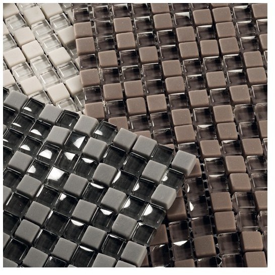 Mosaici di vetro composti da tessere, come il nome suggerisce, estremamente minute di mm 10x10 e mm 6 di spessore. Le due tipologie di vetri sono classico vetro + pasta vetrosa a tutta massa e completamente riciclata. Su rete. Ok pavimento, ok rivestimento.