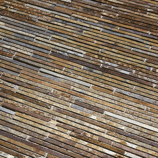 Mosaico a stick di slate (bl 30 e 46) o quarzite (bl10) in vari colori. Finitura anticata, spessore 9/10 mm, su rete. Ok rivestimento. Il belluno grey potrebbe contenere ossido di ferro che, a contatto con l'acqua, a volte rilascia ruggine. Non pregiudica il prodotto. È normale e relativamente comune il distacco superficiale di piccole lamine di prodotto: è testimonianza della naturalezza del prodotto e non modifica l'estetica del medesimo essendo costituito da pietra a tutta massa (sotto la pietra c'è sempre altra pietra).
